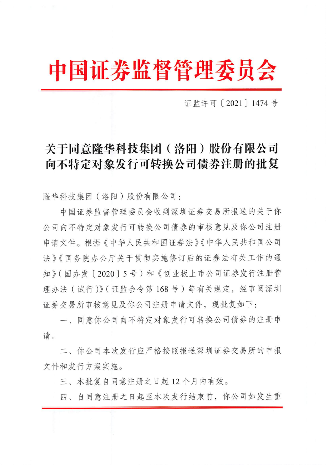 近日,隆華科技收到中國(guó)證券監(jiān)督管理委員會(huì)出具的《關(guān)于同意隆華科技集團(tuán)(洛陽)股份有限公司向不特定對(duì)象發(fā)行可轉(zhuǎn)換公司債券注冊(cè)的批復(fù)》(證監(jiān)許可〔2021〕1474號(hào))。