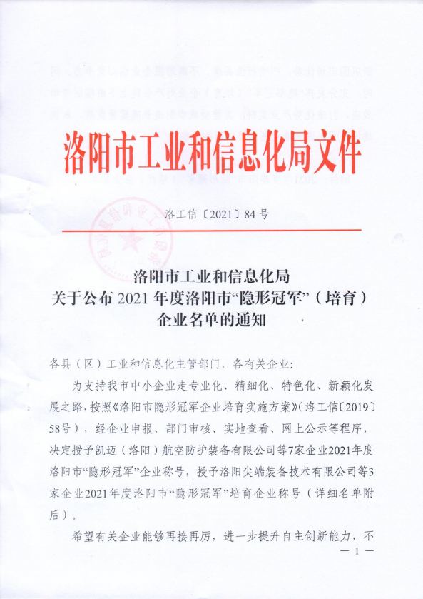近日,洛陽市工業和信息化局印發了《關于公布2021年度洛陽市“隱形冠軍”(培育)企業名單的通知》(【2021】84號),洛陽科博思新材料科技有限公司榮獲“隱形冠軍”企業稱號。